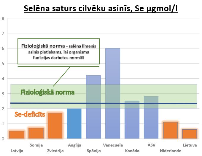 Selēna saturs Latvijas iedzīvotāju asinīs ir pazemināts un vidēji sastāda 0,6 µgmol/l, kas ir būtiski mazāk par vispārpieņemto normu. Ja selēna patēriņš un nodrošinājums ir pietiekošs un fizioloģiski normāls, selēna līmenis cilvēka asinīs sastāda 1,51 – 2,05 µgmol/l. Aprēķini parāda, ka selēna patēriņš cilvēkam Latvijā ir nepietiekošs un sastāda tikai 15 – 40 µg selēna dienā, bet fizioloģiskais pieprasījums ir 50 – 200 µg selēna dienā.